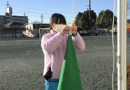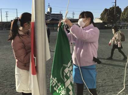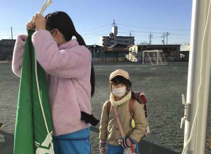 今朝の様子です。今日も進んで旗を掲げてくれました。また、挨拶の素晴らしい2年生が興味をもって見ていました。