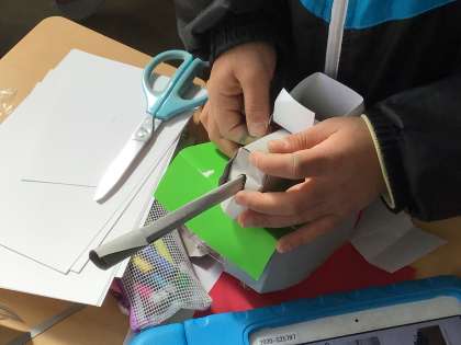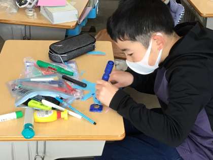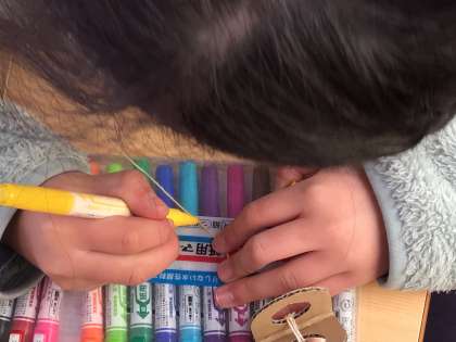 「ゴムゴムパワー」最終段階です。ひもに色をつける子、飾り付けをする子、動きの確認をする子、名札を書く子…みんな一生懸命です。