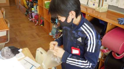 家庭科では、手袋を使い、どうしたら暖かくなるかを実験しました。袋の中に空気を入れた方が暖かいのか、それとも空気を入れない方が暖かいのかという疑問について、実験をしながら確かめることができました。