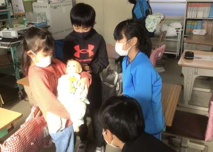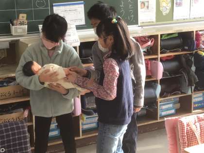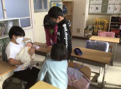「思ったより重いね」「首がぐらぐらだから気を付けて」などと言いながら、交代で抱っこしました。本当の赤ちゃんのように大切に抱き、なでたり、あやしたりする姿がかわいらしかったです。