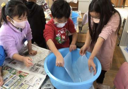 いよいよはんがをすります! まずは、紙を水につけて、ほどよく水気を吸い取ります。
