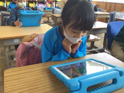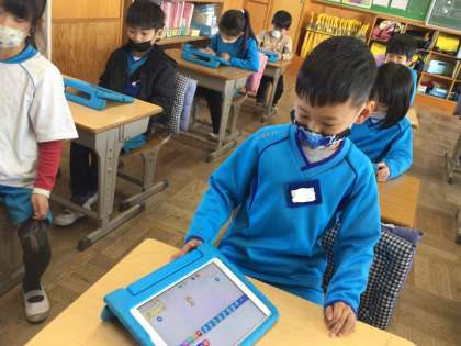 「スクラッチジュニア」のアプリを使って、プログラミング学習をしました。今日は、キャラクターの動きを自動化することをめあてに取り組みました。