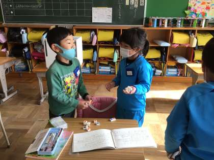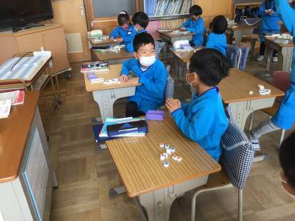 ブロックつかみゲームをして、数の多い方、少ない方を比べました。