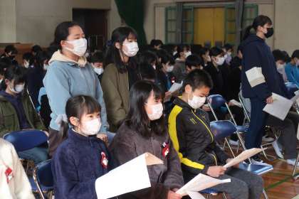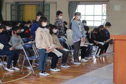 今日は、入退場と別れの言葉、卒業証書授与の練習を行いました。1組の様子です。