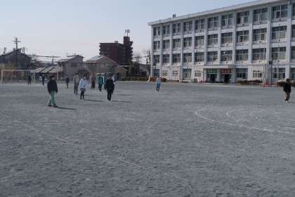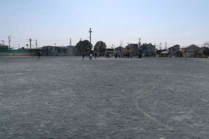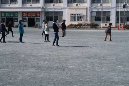 運動場背延滞を利用して、だるまさんがころんだを行いました。タッチする代わりにタグを使いました。