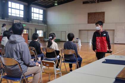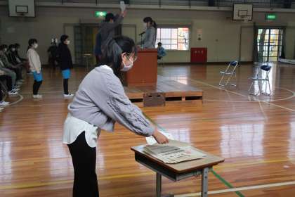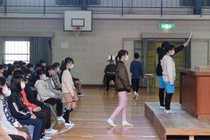 卒業証書授与の練習です。卒業証書を置いた後に気をつけの姿勢で少し止まります。シャッターチャンスです。