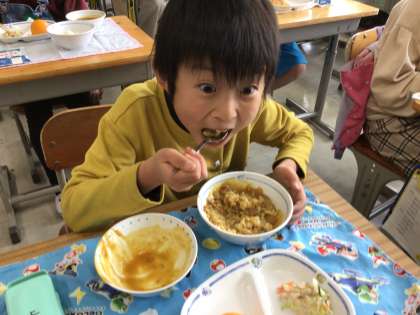カレーライス、ビーンズサラダ、はっさく、牛乳。このクラスみんなで食べる、最後の給食でした。来年も、おいしい給食をお楽しみに!!