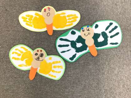 4月の掲示物を作りました。 手形アートでちょうちょを作りました。