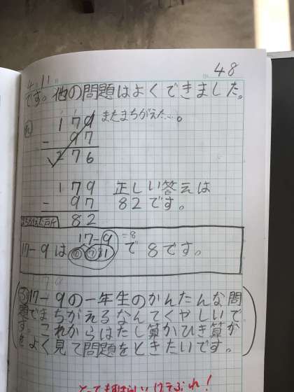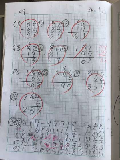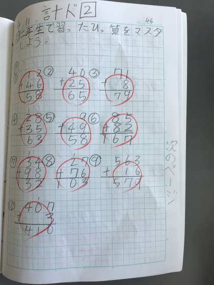 この子は算数の計算練習で、け=計画、テ=テスト、ぶ=ぶんせき、れ=練習 を行なっています。