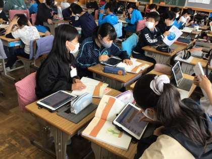 『サボテンの花』の学習の様子です。スカイメニューのアプリのグループワークの機能を使って、文章の読み取りをしたり文章表現の工夫を見つけたりしたりしました。