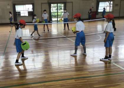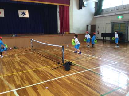 体育の授業では、整列の仕方の確認をしました。また、テニピンも練習しました。