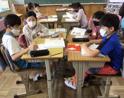 自分の考えをグループで発表しています。友達の考えのよいところをワークシートに記入しています。