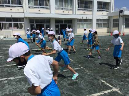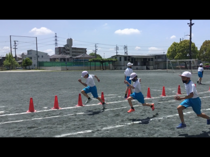 スタートダッシュ時の前傾姿勢がだいぶ定着してきた児童が増えてきました。中間地点では、足を引き上げて、ストライドをなるべく広くすることを意識しています。