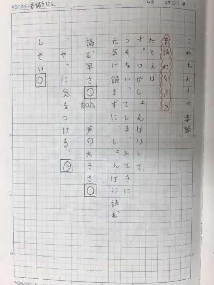 自分で必要な学習内容を考えて行っています。今週行われる音読発表会に向けて工夫したことを明確にしています。また、漢字テストの練習や算数の単元テストに向けて学習しています。