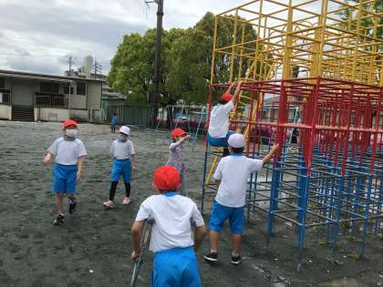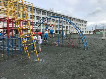 水溜りだらけで50m走の練習ができなかったので遊具で遊びました。楽しいね!