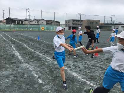 2年生と6年生でリレー対決をしました。30秒間のハンデをつけての勝負。接戦で大盛り上がりでした。