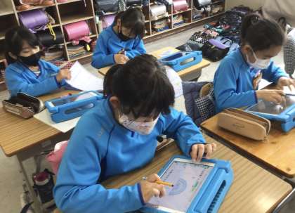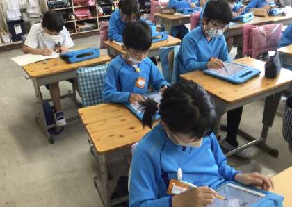 学習用タブレットを使って計算ドリルの問題を解いていました。
