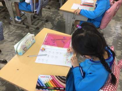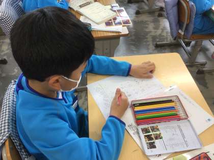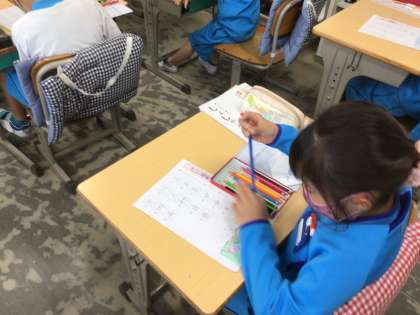 早く終わると、下の部分にあった挿絵をきれいに色塗りしています。鉛筆の力加減の練習になりますね。
