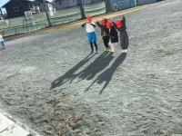 運動場の掃除は、4年生と一緒に行っています。今は、芝生の草取りをしています。