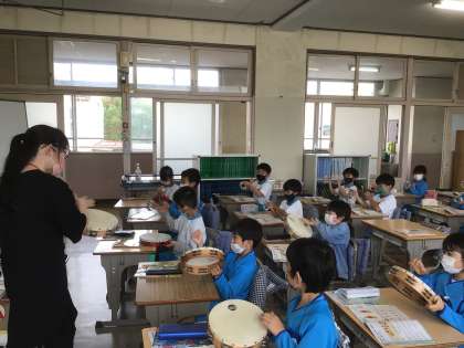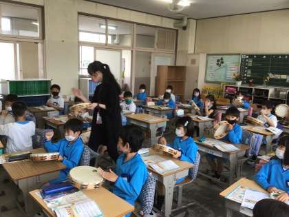 楽器を使って、3拍子の練習をしました。楽器が触れるだけで、何だか嬉しそうです。