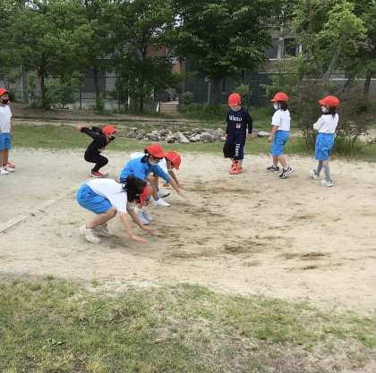 立ち幅跳びの練習です。カエルになったつもりで「ゲコー」と言いながら跳ぶと、記録が少し伸びました。