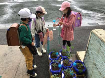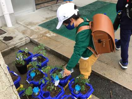 手洗い場でペットボトルのジョウロに水を入れていました。