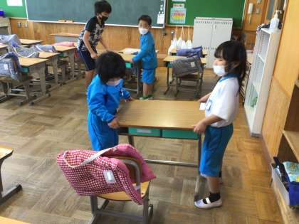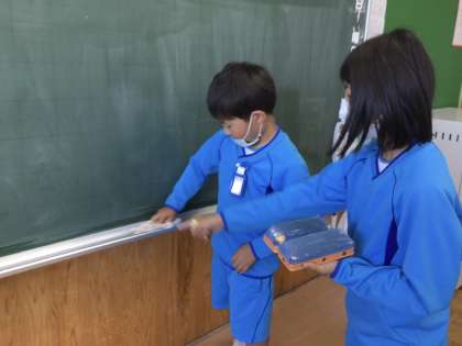 6年生のお兄さん、お姉さんに教えてもらいながら掃除をしています。
