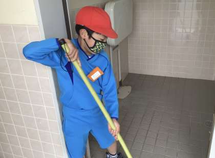 運動場トイレの掃除の様子です。床をほうきで隅々まで丁寧に掃いていました。