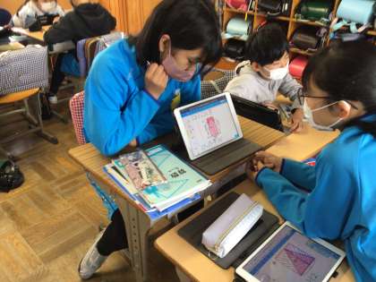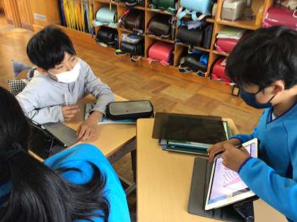 文字と式の学習の様子です.式の意味を、図形に書き込みながら説明し合っています.