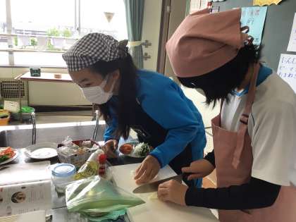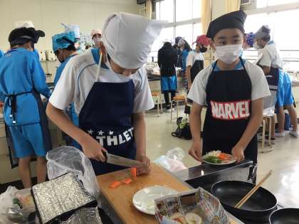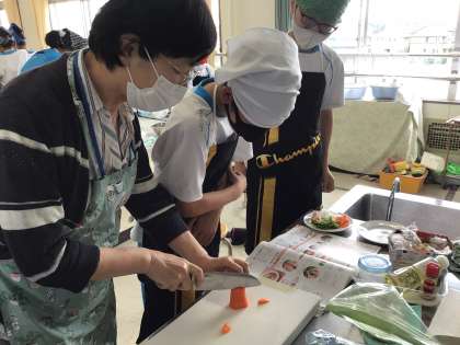 今日は、感染予防対策を徹底して、調理実習を行っています。