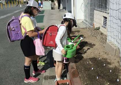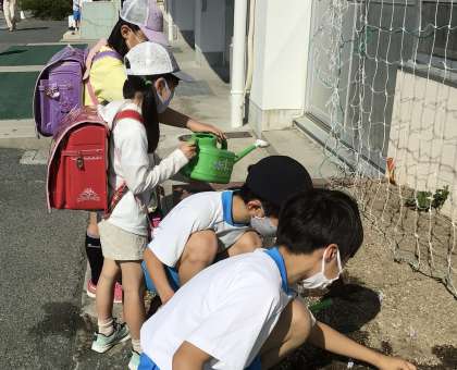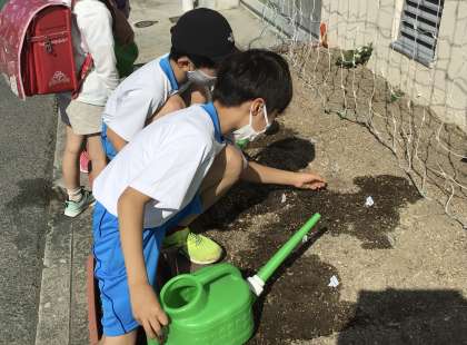 この日も登校後にツルレイシに水やりを行なっていました。