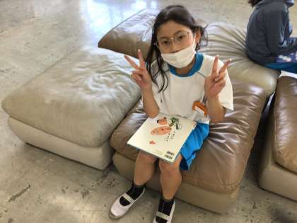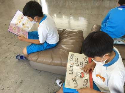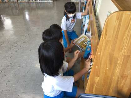 2組の授業の様子です。図書館で1年生に紹介する本を探しました。