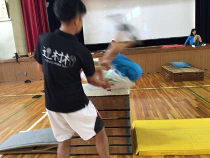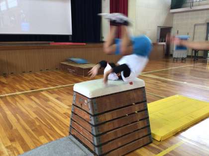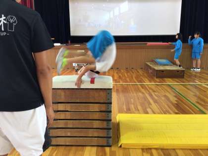 6年生の跳び箱運動では、大きな台上前転、そして首はね跳びに挑戦していきます。自分の動きを、スクリーンで確認して、技の精度を磨いていきます。