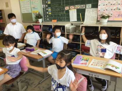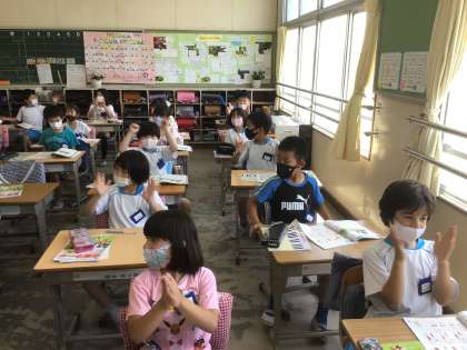 曲に合わせて、楽しく踊っています。みんなで、手拍子をしたり体を動かして拍を感じています。