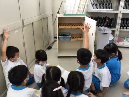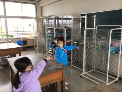 図工室に絵を乾かす棚がたくさんあるのを見つけたり