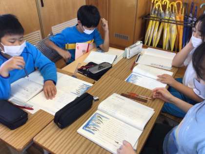 『風切る翼』の学習の様子です。今日は、班で協力して場面分けをしています。