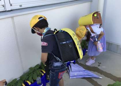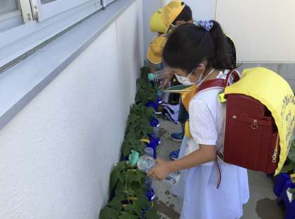 朝の様子です。自分の朝顔にたくさんの水をあげていました。