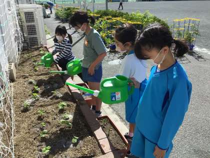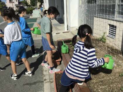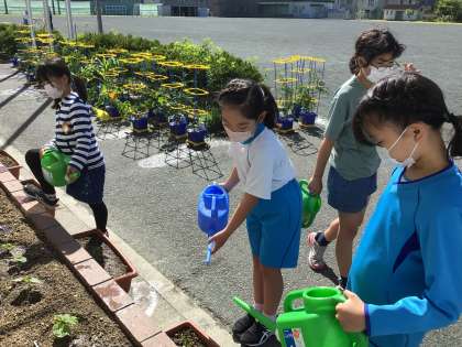 4年生はツルレイシに水やりを行っています。自分の学級で植えたツルレイシに水をあげています。