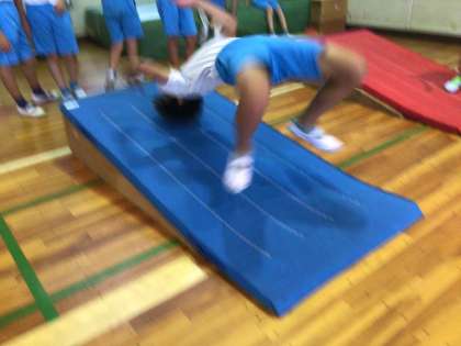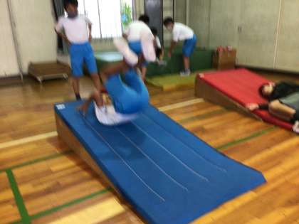 首跳ね飛びができるようにするために、まずは傾斜をつけたマット場でネックスプリングに挑戦しています。普段、使わない首の筋肉を使う技なので、苦戦しながらも何度も挑戦しています。