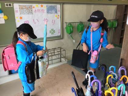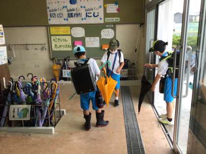 今朝は雨天のため、涼しかったですが子ども達は元気に登校していました。