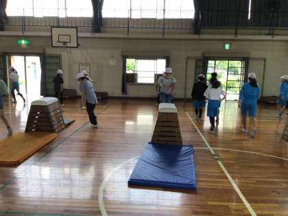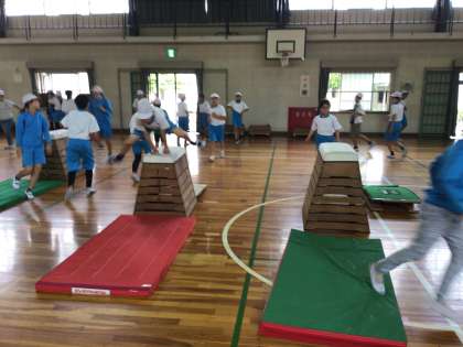 台上前転をできるようにするために、段差をつけた足場から、舞台上に向かって前転をする練習にに取り組んでいます。今日も、新しい技ができるようになった人がたくさんいました。