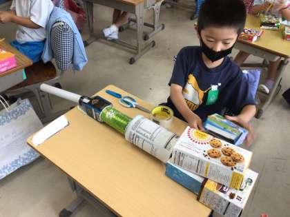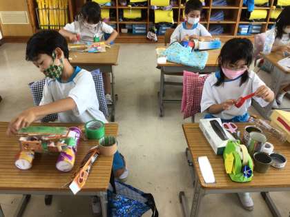 いろいろな形の箱を使って、思い思いの作品を作っていきました。
