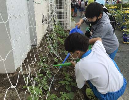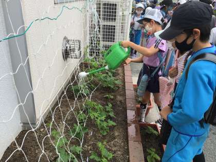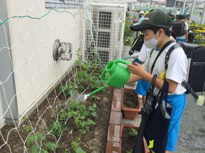 どんどん大きく育っているツルレイシに水やりを行なっています。