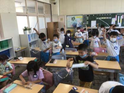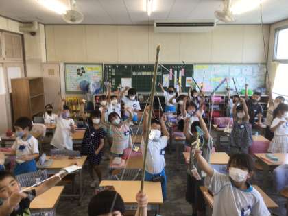 「つりざお、できたよ!」と、パシャリ!ザリガニ釣りには、出かけられなかったけれど、自分でつりざお調べて考えて、作ったよ。