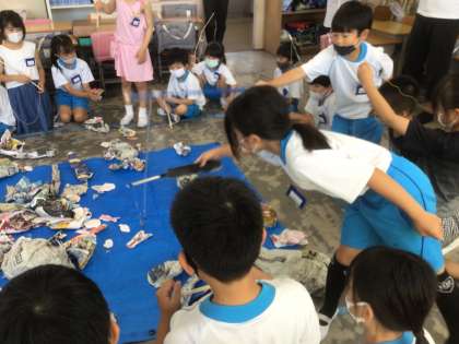 グループ対抗の、「生きものつり大会」です。みんなで、たくさん生きものを釣り上げ、楽しみました。