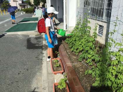 朝の水やりの様子です。この日は、暑かったので、日傘を持ちながら行なっていました。