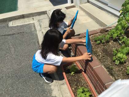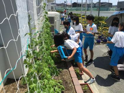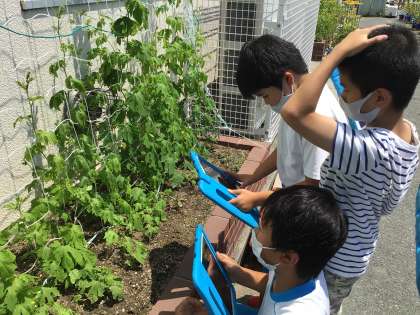 自分達が育てているツルレイシを撮影していました。