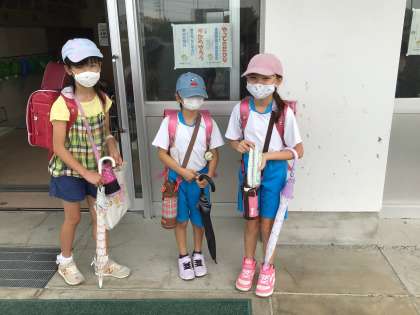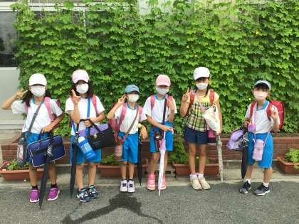 大きく育っているツルレイシと一緒に。また、挨拶ボランティアも行っていました。