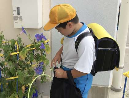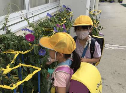 朝、アサガオに水やりを行なっている様子です。この日も朝から暑かったのでたくさんの水をあげていました。