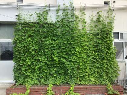 今朝の様子です。ツルレイシのツルが2階まで届いていました。緑のカーテンの役割を果たしています。